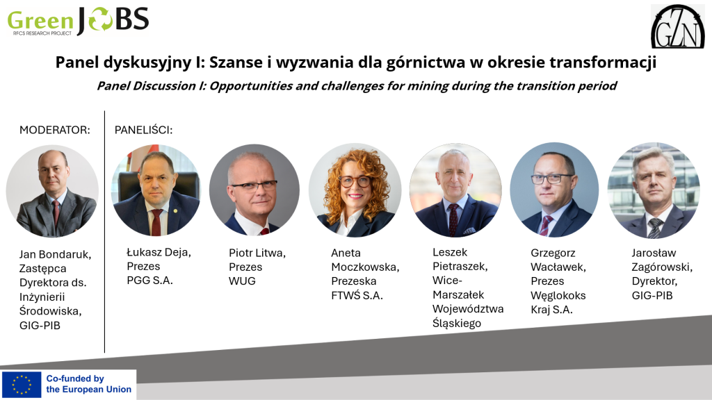 Third a Discussion panel titled “Opportunities and challenges for mining during the transition period. Where are we now? What lies ahead?” moderated by Jan Bondaruk (GIG-PIB) with the participation of Łukasz Deja (Polska Grupa Górnicza S.A.); Piotr Litwa (WUG), Aneta Moczkowska (Silesian Province Transformation Fund S.A.), Leszek Pietraszek (Marshal’s Office of the Silesian Province), Grzegorz Wacławek (Węglokoks Kraj S.A.); and Jarosław Zagórowski (GIG-PIB) was developed.