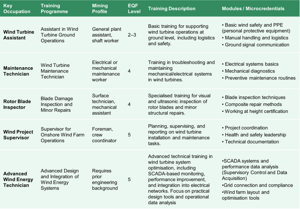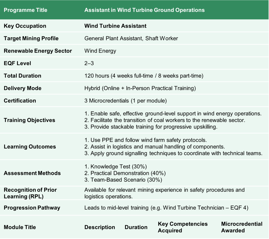All programmes are aligned with the European Qualifications Framework (EQF), ensuring both academic recognition and professional relevance. Their modular and flexible structure, built on micro-credentials where appropriate, enables progressive skill acquisition and supports lifelong learning. The deliverable provides a comprehensive framework for transforming existing mining competencies into future-oriented capabilities for the renewable energy sector.